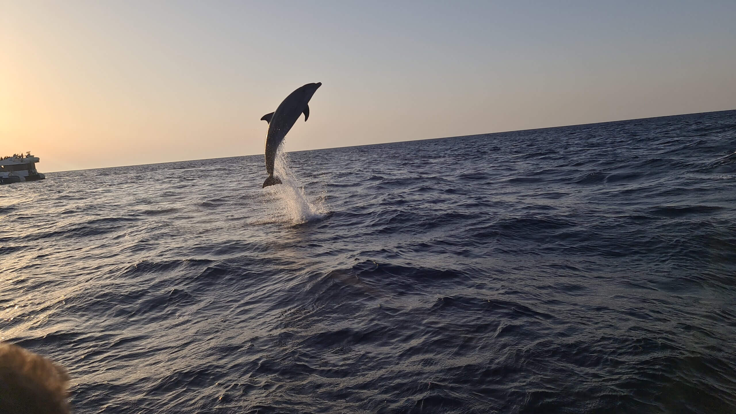 Deze fantastische toch begint al geweldig door de prachtige zonsopgang die je ziet opkomen vanaf de horizon. Vervolgens zweef/vaar je met een rap tempo verder de zee op, waar je na ongeveer een half uur ver genoeg op zee bent voor kans op dolfijnen. Wij zagen vrijwel direct al kleine groepjes dolfijnen rond ons zwemmen. Volgens de Spaanse wetgeving mag je niet in de zee zwemmen rond de dolfijnen, en juist dat maakt deze ervaring ook zo ontzettend mooi. Je kan alleen maar zitten en genieten van het prachtige natuur om je heen.